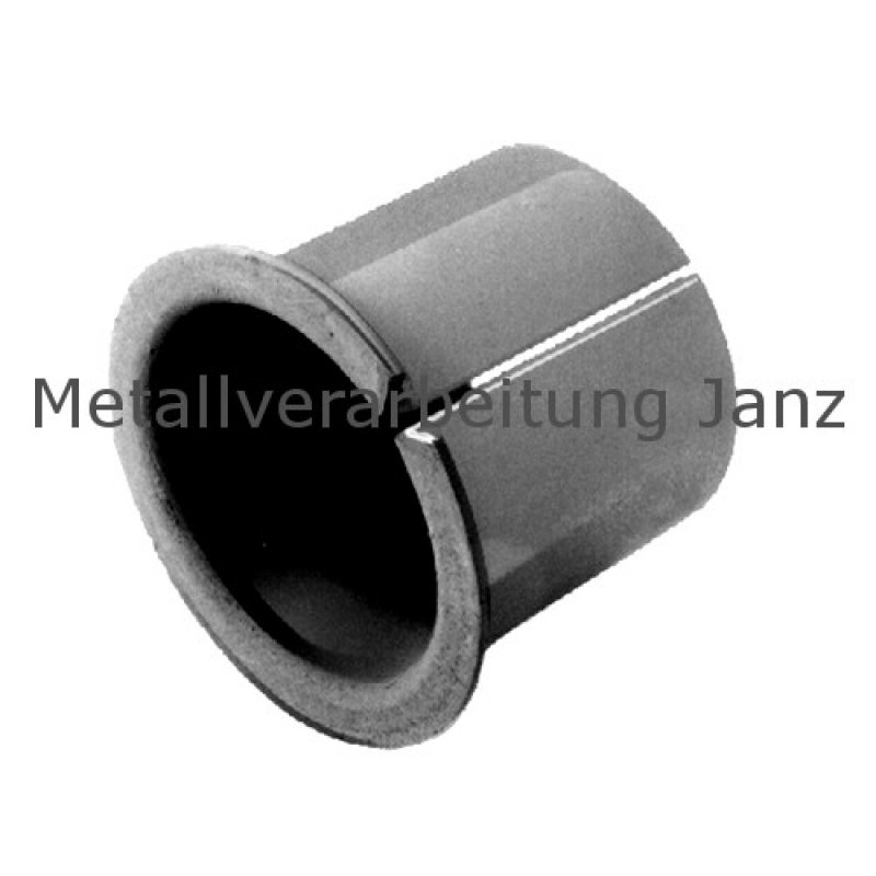 Völlig ungeschmierte Gleitlager Aufbau: Verzinnter Stahlrücken (inkl. Kanten). Multiporöse Bronzeschicht, Gleitschicht PTFE-Blei-Gemisch. Technische Daten: Stat. Flächenpressung max. 250 N/mm². Dyn. Lagerbelastung max. 56 N/mm². Reibungskoeffizient von 0,03 - 0,20. Gleitgeschwindigkeit max. 2 m/s. Temperaturbereich -195 °C bis + 280 °C. Therm. Leitfähigkeit 40 W/K*m. Empfohlene Einbautoleranzen: Gehäusebohrung H7, Wellentoleranz bis Ø55 : f7. Über Ø55: h8. Hauptmerkmale: Selbstschmierend und wartungsfrei. Einbaufertig. Optimal geeignet für niedere Gleitgeschwindigkeiten. Geringer Verschleiß, niedriger Reibungswert, kein ""Stick Slip"". Beste Eignung für Umlauf-, Schwenk- und teilweise Axialbewegungen. Einsatz bei höchsten Lagerdrücken. Unempfindlich gegen Stoßbelastungen. Keine Feuchtigkeitsaufnahme. Hohe Korrosionsbeständigkeit.